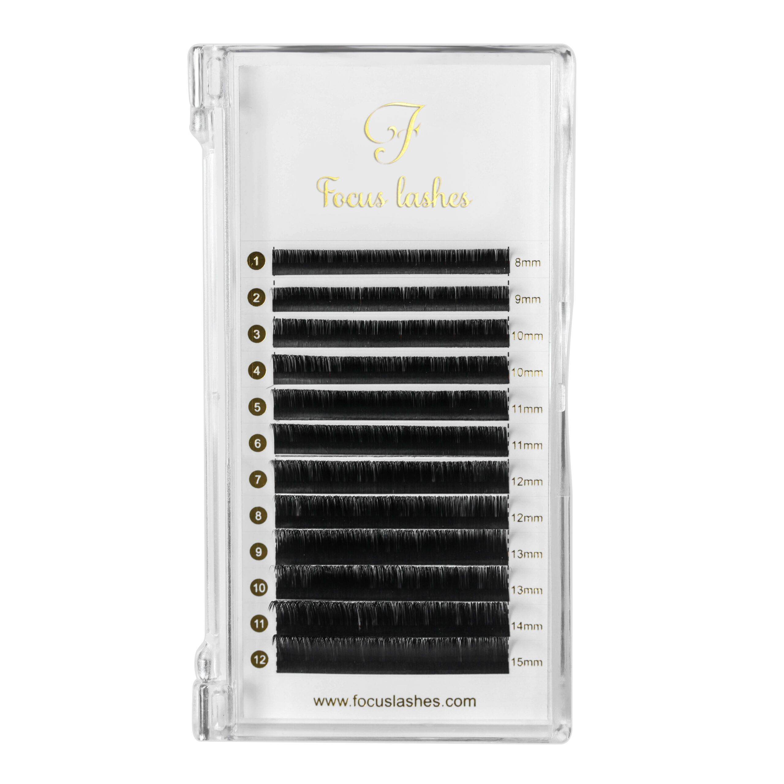 Focus Lashes are made with the finest Korean PBT fibers. Each row is double-checked to ensure the best condition when received. We have various thicknesses, lengths, curls, and colors allowing for customization. All of our lash trays include 12 lash strips per tray.